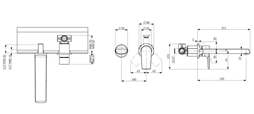 Смеситель для раковины однорычажный скрытого монтажа. Материал: Латунь. Картридж керамический. Напор 4,9 l/min.