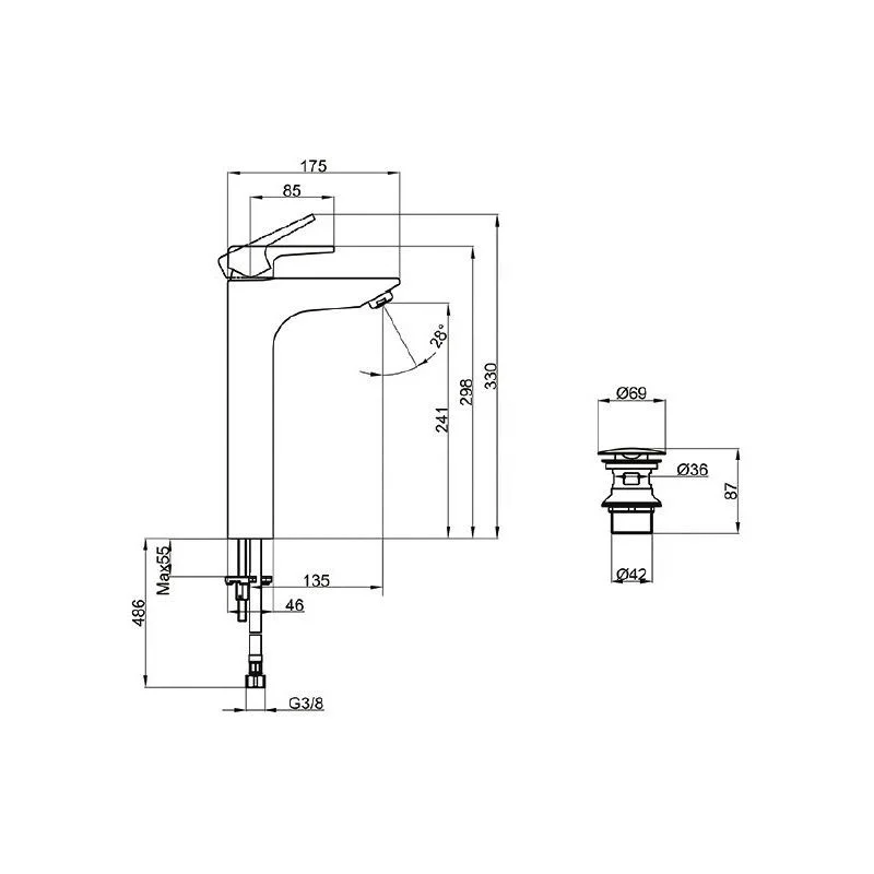 В комплекте донный клапан с выдвижным механизмом слива