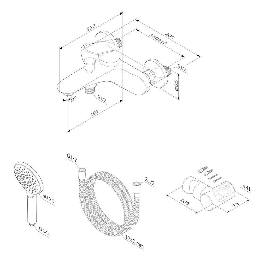 В комплекте душевой набор: стильный ручной душ 120 мм 3 режима настенный держатель с регулировкой угла наклона душевой шланг с защитой от скручивания. ""