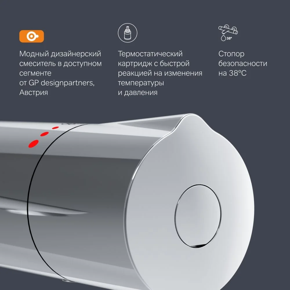 Термостатический картридж с высокочувствительным термоэлементом и быстрой реакцией на изменения температуры или давления в водопроводной сети надежно защищает от ожога даже при внезапном отключении холодной воды.