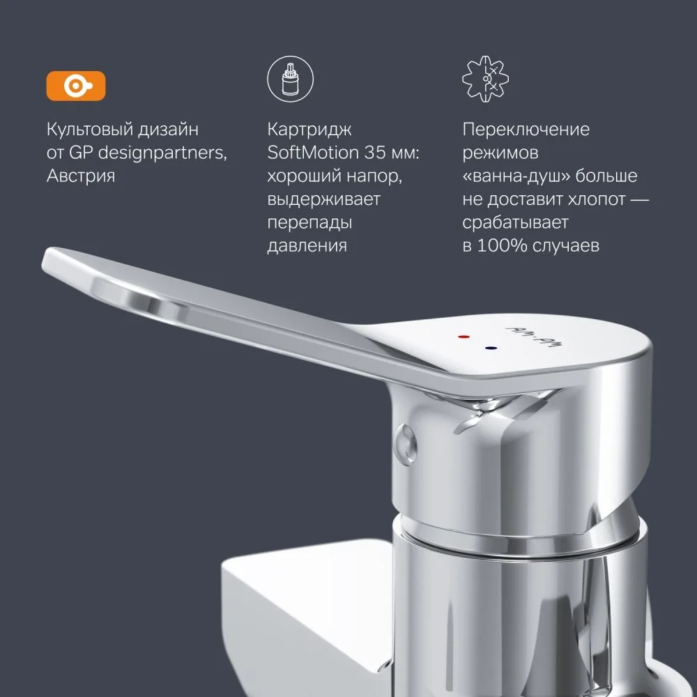 Ультрамодный дизайн ручки придает смесителю дополнительную динамику и дарит непревзойденную легкость управления. Вы почувствуете это с первого прикосновения. Точная инженерия для Вашего комфорта: благодаря обширной зоне движения ручки управлять температурой воды стало еще проще.