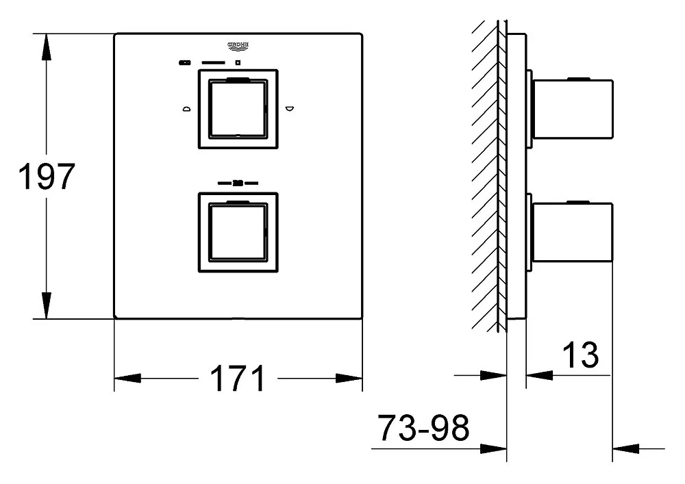 Этот блок управления с глянцевым покрытием гармонично сочетается с оборудованием серии GROHE Eurocube. Рукоятки кубической формы отличаются великолепной эргономикой и обеспечивают точность управления, позволяя с легкостью регулировать температуру и напор воды. Регулятор AquaDimmer Eco позволяет плавно перенаправлять поток воды между выпуском для ванны и душем либо между верхним и ручным душами. Стопор SafeStop оберегает Вас от ошпаривания, предотвращая случайное увеличение температуры, а переключатель EcoButton позволяет перевести душ в режим ограниченного расхода воды. Система монтажа GROHE QuickFix позволит быстро установить данное оборудование. Если Вам нравится строгий дизайн, основанный на четких линиях, выберите для преображения своей ванной комнаты данный термостат. Пожалуйста, обратите внимание на то, что данный комплект оборудования для настенного монтажа должен устанавливаться в комбинации со встраиваемым термостатом GROHE Rapido T (35500000). За счет технологии GROHE TurboStat, лежащей в основе его