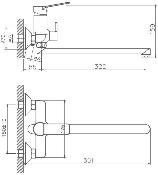 Керамический картридж 35 мм. Диаметр декоративных чашек 70 мм. Душевой гарнитур в комплекте. Межосевое расстояние (расстояние между выходом горячей и холодной трубы) 150 мм. Данное расстояние изменяется за счет входящих в комплект эксцентриков на 10 мм в большую или меньшую стороны.