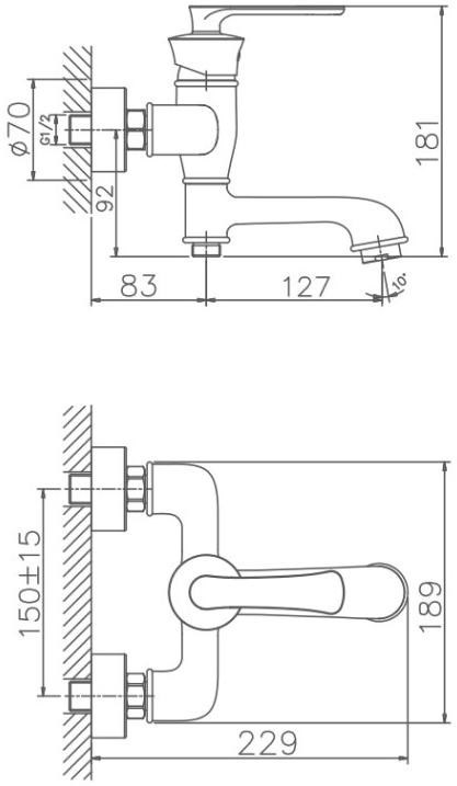 Особенностью данной модели является переключение потока воды путем поворота излива смесителя. Керамический картридж 35 мм. Диаметр декоративных чашек 70 мм. Душевой гарнитур в комплекте. Межосевое расстояние (расстояние между выходом горячей и холодной трубы) 150 мм. Данное расстояние изменяется за счет входящих в комплект эксцентриков на 15 мм в большую или меньшую стороны.