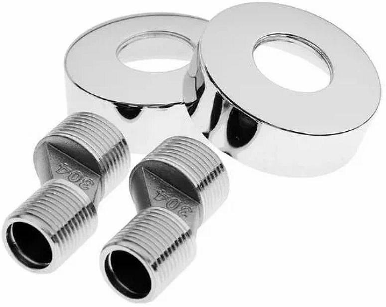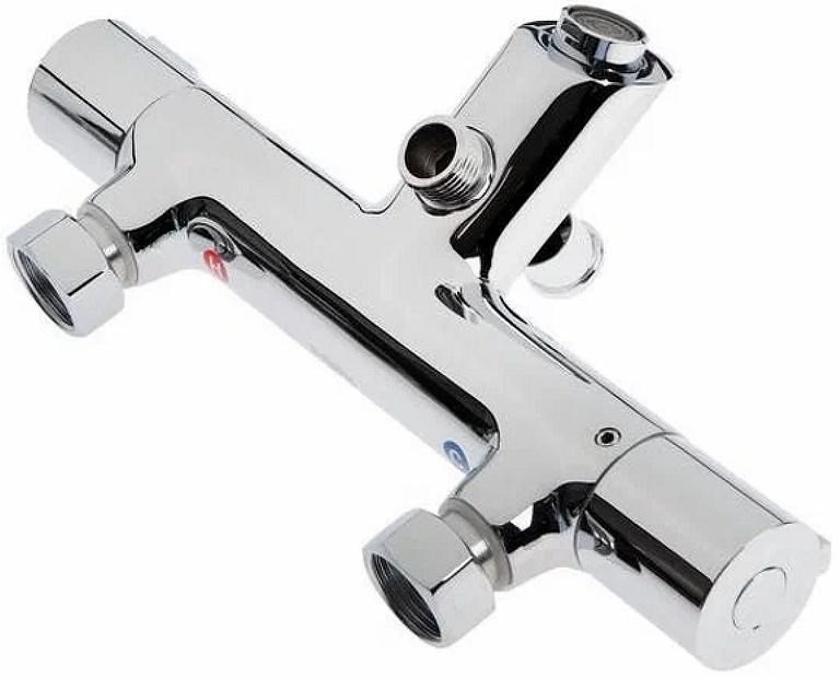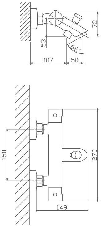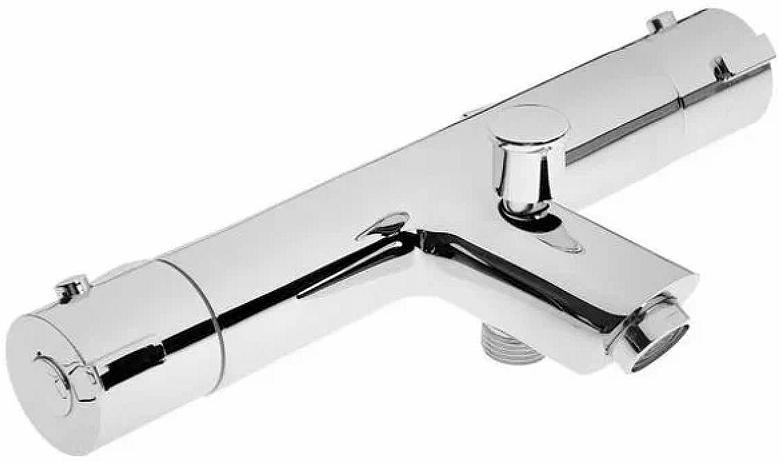 Смеситель для ванны с термостатом. Керамический картридж 35 мм. Диаметр декоративных чашек 60 мм. Душевой гарнитур в комплекте. Межосевое расстояние (расстояние между выходом горячей и холодной трубы) 150 мм. Данное расстояние изменяется за счет входящих в комплект эксцентриков на 10 мм в большую или меньшую стороны.