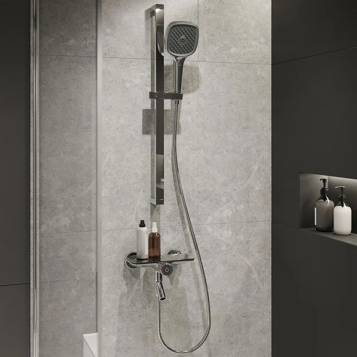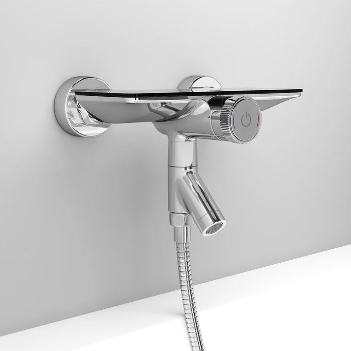 Смеситель Shefy – мечты о будущем доступные уже сегодня! Смеситель обращает на себя внимание дизайнерским корпусом с декоративными элементами из закаленного стекла и продуманным функционалом. Кнопочное управление Push Control – одновременно технологичное и невероятно простое – позволяет осуществлять включение-выключение воды мягким нажатием кнопки и регулировать температуру ее поворотом. Лаконичная форма Shelfy будет созвучна как классическому, так и современному интерьеру. А плоская поверхность смесителя возьмет на себя роль небольшой полочки – на ней легко разместятся шампуни и гели для душа. Без душевых аксессуаров в комплекте.