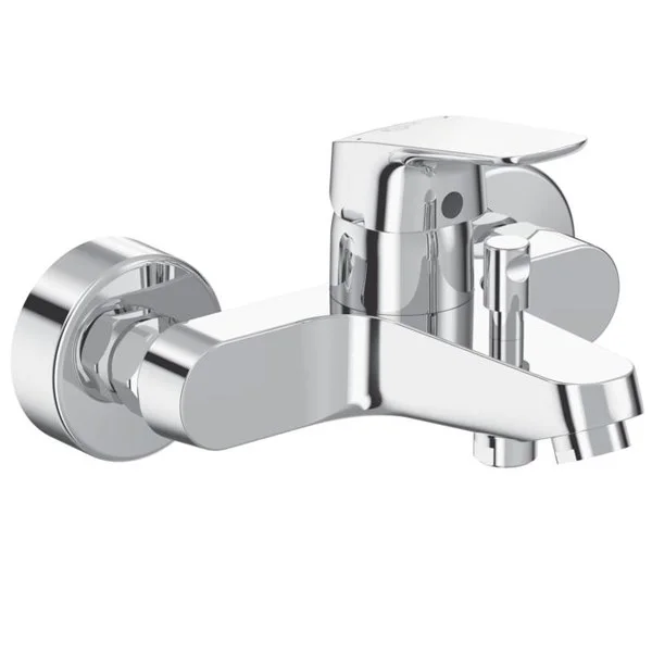 CERAFLEX Настенный однорукоятковый смеситель для ванны и душа, монтаж на стандартных эксцентриках (в комплекте: эксцентрики, металлические отражатели, уплотнительные прокладки), литой излив, аэратор Perlator, керамический картридж IS 40 мм, с функцией HWTC (ограничение максимальной температуры горячей воды), с функцией CLICK (ограничение потока воды), металлическая рукоятка с индикаторами горячей / холодной воды, автоматическое переключение ванна/душ, обратный клапан