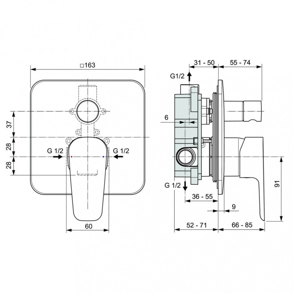 ESLA Встраиваемый смеситель для ванны/душа, комплект №1 A1300NU (встраиваемая часть) + комплект №2 (внешняя часть), картридж 47 мм с функцией HWTC, с функцией CLICK, металлическая рукоятка с индикатором горячей / холодной воды, автоматическое переключение ванна/душ
