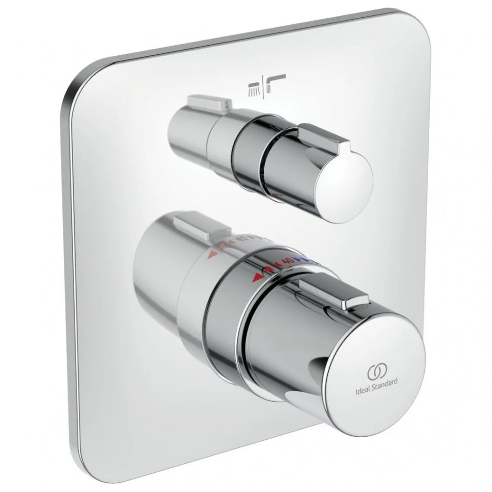 TONIC II Термостатический индивидуальный встраиваемый смеситель для ванны и душа, комплект №2 (внешняя часть), термостатический картридж (новая технология), затворы на керамических дисках G1/2 180?, клапаны на керамических дисках 90o, с интегрированным переключением ванна/душ, без душевого гарнитура, пластиковая рукоятка с ограничителем температуры (40oC), металлическая плоская накладка. Для монтажа с A1000NU