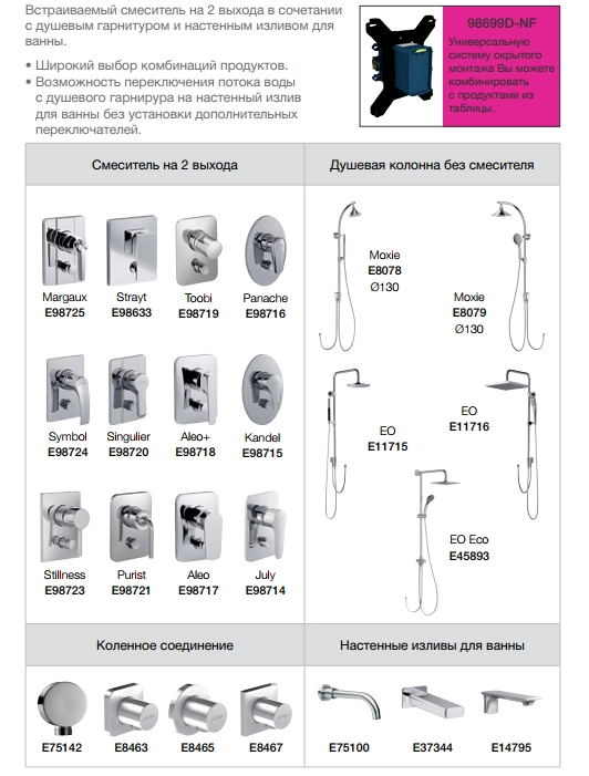 2. С душевым гарнитуром, верхним душем и коленным соединением. Возможность переключения потока воды с душевой лейки на верхний душ без установки дополнительных переключателей.