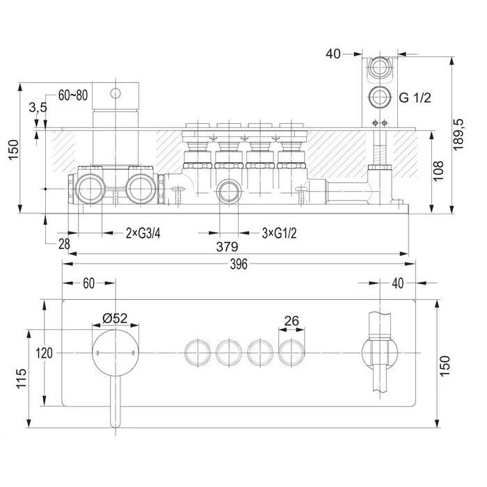 - четыре выхода смешанной воды: 1/2” (расход: 20 л/мин. на каждом выходе);