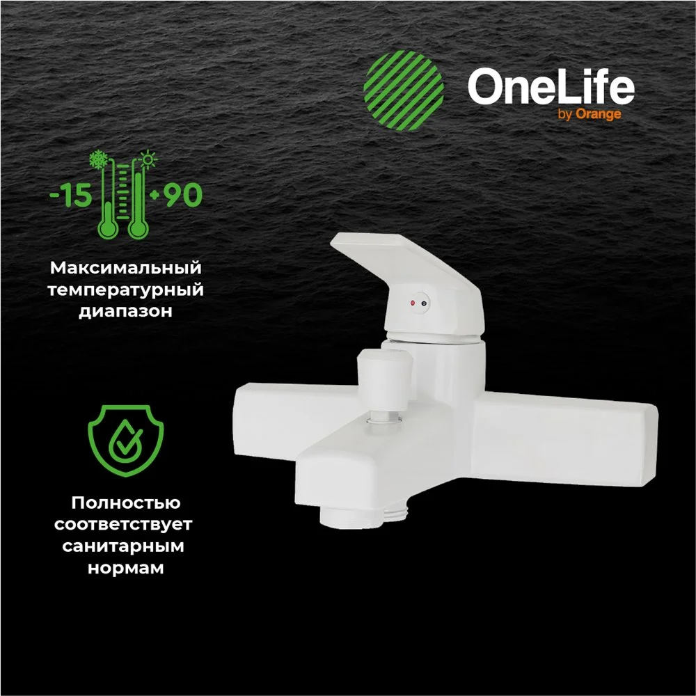 Однозахватный полимерный смеситель для ванны/душа с фиксированным изливом OneLife гармонично дополнит интерьер ванной комнаты в современном или традиционном стиле. Фирменный картридж Orange обеспечит легкое управление напором и температурой воды. Вместо привычного латунного сплава он изготовлен из запатентованного высокотехнологичного полимера (выдерживает 510 000 циклов и 53 АТМ без замены изделия после теста на цикличность, исключает возможность обжечься при касании, не подвержен коррозии и окислению, стойкий к отрицательным температурам), что обеспечивает срок службы более 15 лет. Встроенный аэратор экономит воду и, обогащая струю воздухом, делает её мягкой и без брызг. Переключение между режимами душ/ванна осуществляется с помощью вытяжного дивертора. Цвет глянцевый белый.