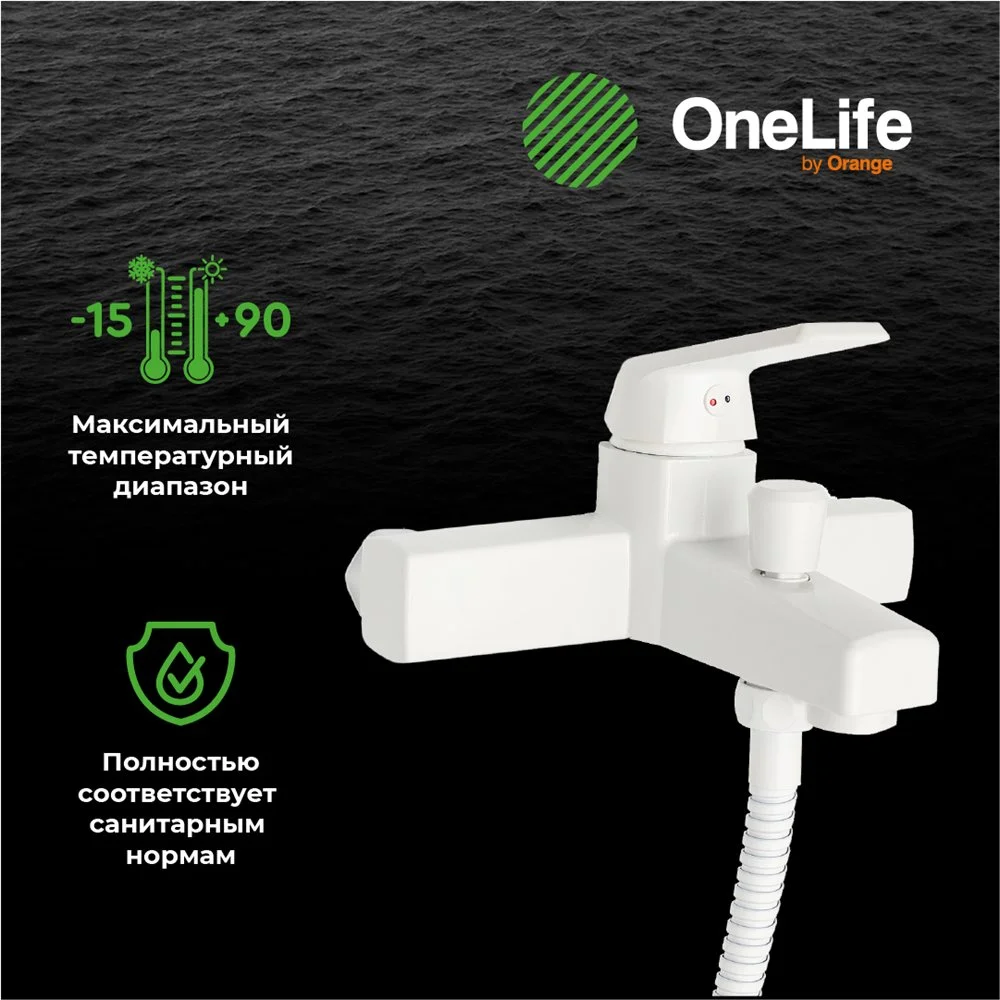 Однозахватный полимерный смеситель для ванны/душа с фиксированным изливом и душевым набором OneLife гармонично дополнит интерьер ванной комнаты в современном или традиционном стиле. Фирменный картридж Orange обеспечит легкое управление напором и температурой воды. Вместо привычного латунного сплава он изготовлен из запатентованного высокотехнологичного полимера (выдерживает 510 000 циклов и 53 АТМ без замены изделия после теста на цикличность, исключает возможность обжечься при касании, не подвержен коррозии и окислению, стойкий к отрицательным температурам), что обеспечивает срок службы более 15 лет. Встроенный аэратор экономит воду и, обогащая струю воздухом, делает её мягкой и без брызг. Переключение между режимами душ/ванна осуществляется с помощью вытяжного дивертора. В комплекте душевой набор: ручной душ d 110 мм (3 режима струи) с силиконовыми наконечниками (защита от известкового налета RUB CLEAN), с системой AIR IN; настенный держатель ручного душа с регулировкой угла наклона (в шести позициях); душе
