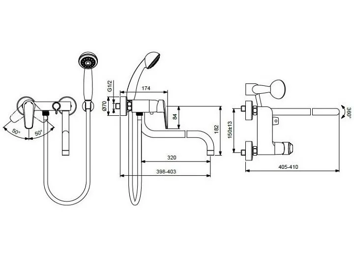 - Переключение ванна/душ: ручной керамический переключатель (позволяет использовать функцию "душ" даже при очень низком давлении воды