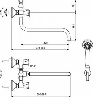 - Смеситель двухвентильный для ванны и душа с длинным изливом