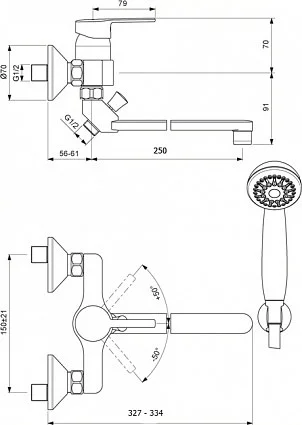 - Переключение ванна/душ: ручное (позволяет использовать функцию "душ" даже при очень низком давлении воды)