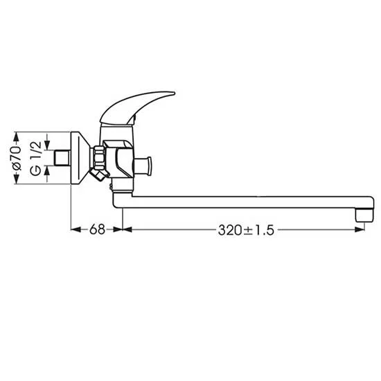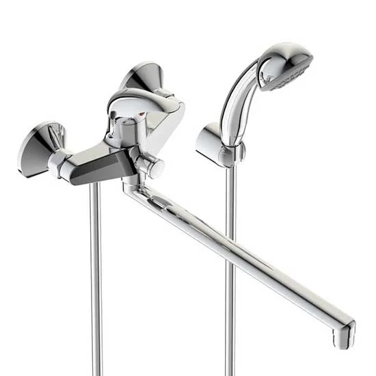 ORION Однорукоятковый настенный смеситель для ванны/душа, монтаж на стандартных эксцентриках (в комплекте: эксцентрики, металлические отражатели, уплотнительные прокладки), трубчатый поворотный излив 320 мм, угол поворота 360˚, аэратор PERLATOR, керамический картридж 35 мм, металлическая рукоятка, индикатор холодной/горячей воды, ручное переключение ванна/душ, душевой гарнитур в комплекте (душевая лейка Ø70 мм, металлический шланг 1500 мм, держатель для лейки).