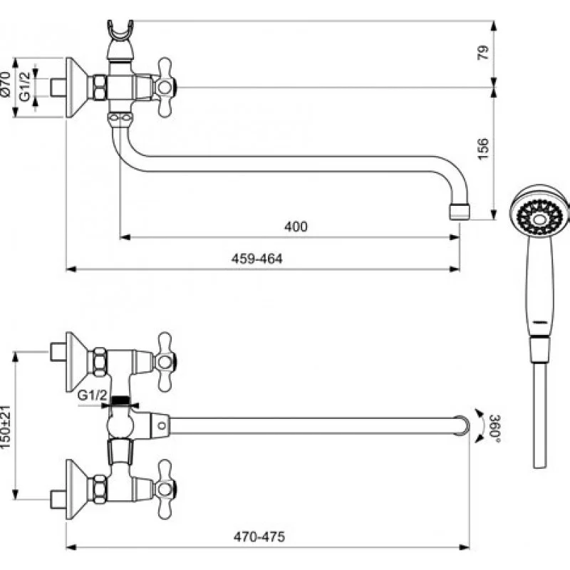 - Смеситель двухвентильный для ванны и душа с длинным изливом