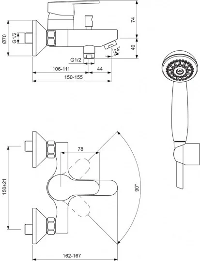 - Переключение ванна/душ: ручное (позволяет использовать функцию "душ" даже при очень низком давлении воды)