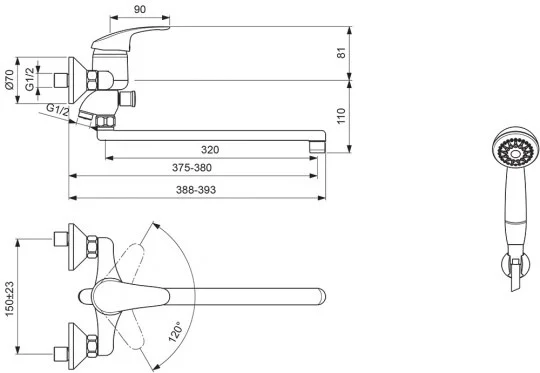 - Переключение ванна/душ: ручное (позволяет использовать функцию "душ" даже при очень низком давлении воды)
