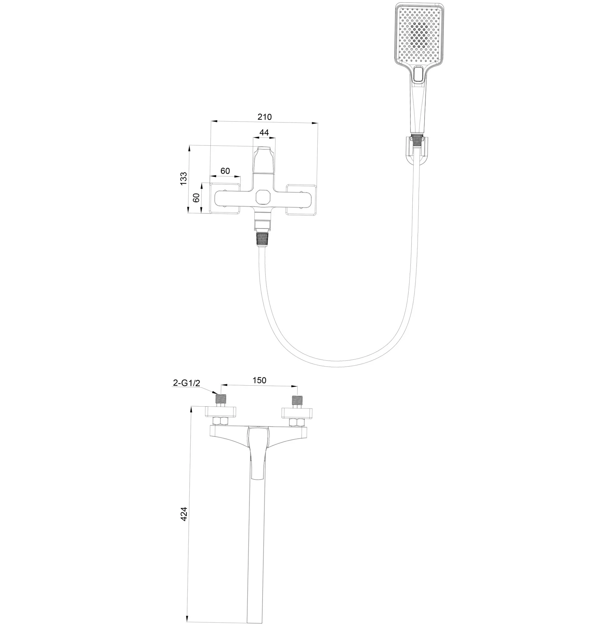 смеситель, душевой шланг/ держатель для душа, душевая лейка, эксцентрики, монтажный комплект