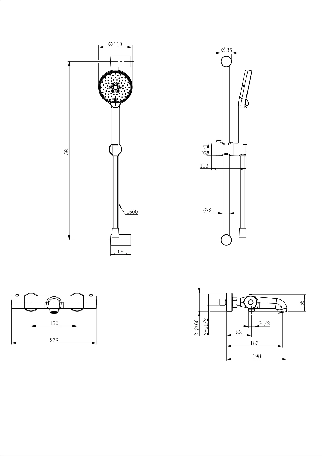 смеситель, душевой шланг/ держатель для душа, душевая штанга, душевая лейка, эксцентрики, монтажный комплект