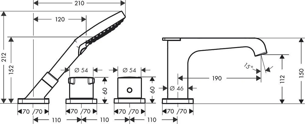 Смеситель на край ванны, на 4 отверстия, с термостатом, внешняя часть.