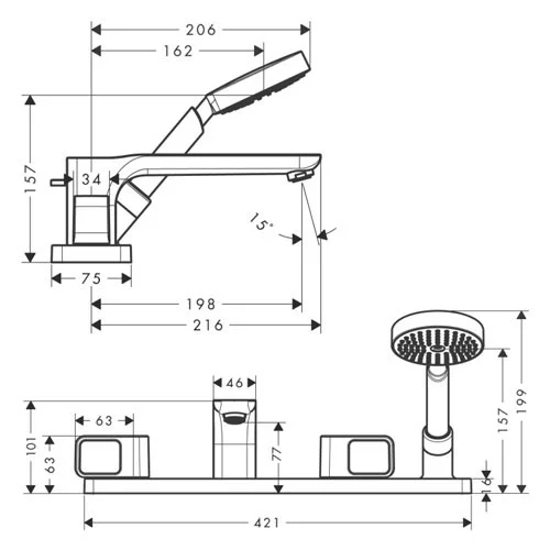 комплект поставки: рукоятки, излив на ванну, ручной душ Raindance S