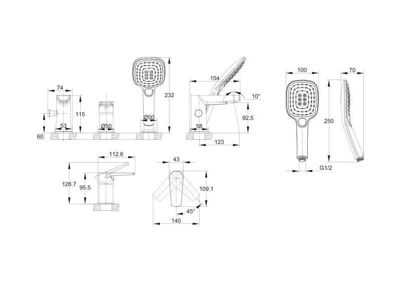 смеситель, излив смесителя, Т-коннектор, монтажный комплект, шланг гибкой подводки воды 35см, душевая лейка, шланг в металлической оплетке 1/2" 150см, декоративное кольцо