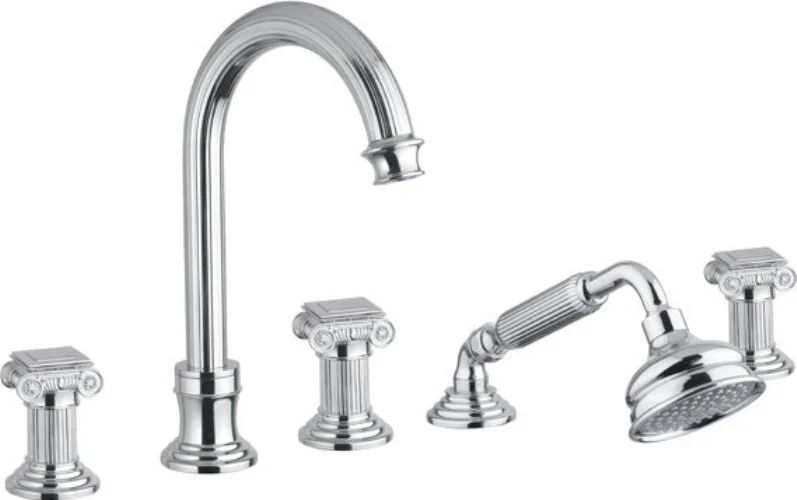 Смеситель на борт ванны с выдвижным душем и переключателем.