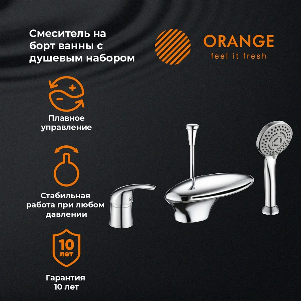 Смеситель для ванны с фиксированным изливом и душевым набором Orange Iris предназначен для установки на борт ванны. Оригинальная футуристичная форма – одна из эстетических особенностей данной модели. Корпус выполнен из высококачественной латуни, не подверженной коррозии от длительного контакта с водой. Глянцевая хромированная поверхность служит защитой от коррозии и внешних механических воздействий. Фирменный керамический картридж Orange и эргономичный рычаг обеспечивают плавный уверенный ход без проскальзываний. Переключение между режимами душ/ванна осуществляется с помощью вытяжного дивертора. В комплекте душевой набор: душевая лейка d90 мм (3 режима), шланг в металлической оплетке 1500 мм (с защитой от перекручивания).