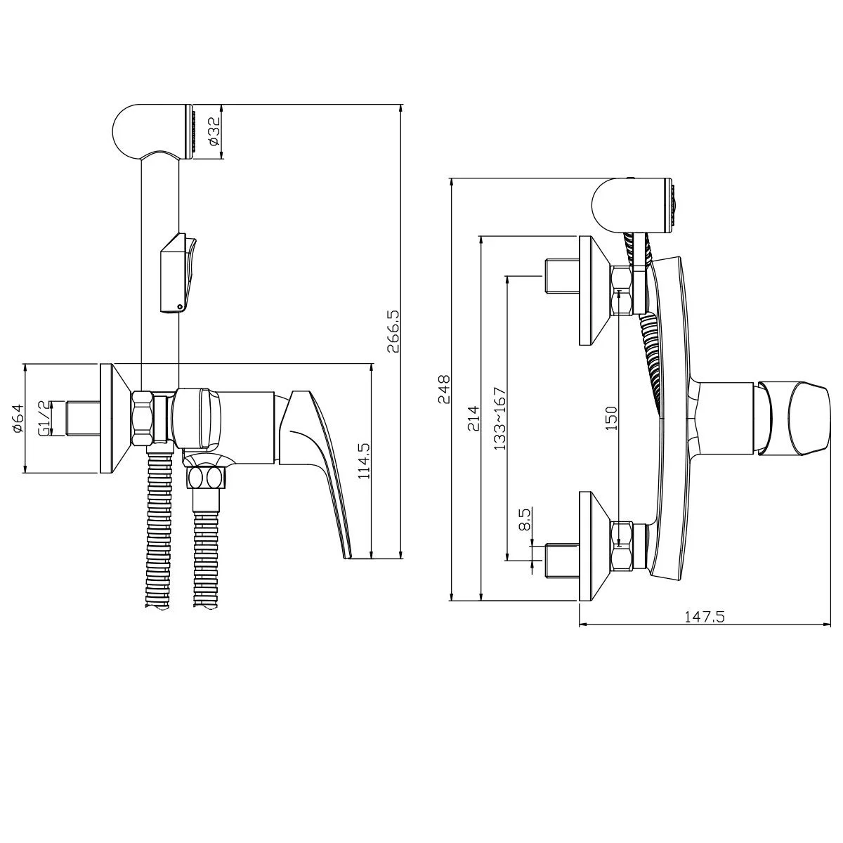 - Аксессуары в комплекте (шланг 1,2 м, лейка гигиенического душа с нажимным механизмом с функцией легкой очистки)