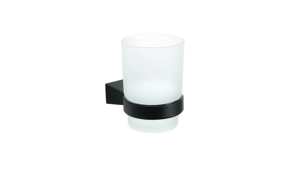 Настенный стаканчик для зубных щёток. Материалы - окрашенная чёрной матовой эмалью сталь, матовое стекло.
