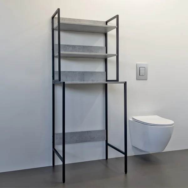 Напольный стеллаж изготовлен из стального профиля, покрытого черной матовой эмалью, полки из ЛДСП цвета бетон светлый. Стеллаж для установки над стиральной машиной.