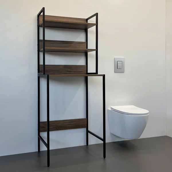 Напольный стеллаж изготовлен из стального профиля, покрытого черной матовой эмалью, полки из ЛДСП цвета дуб темно-коричневый. Стеллаж для установки над стиральной машиной.