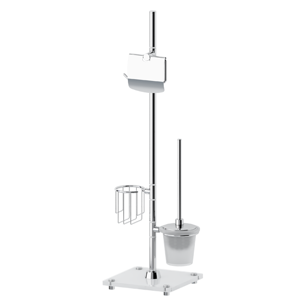 Коллекция включает в себя пять видов напольных стоек различной комплектации. Высота штанги напольных стоек составляет 80 см. Основание стоек выполнено из качественного матированного белого стекла толщиной 12 мм и укомплектовано четырьмя металлическими опорами. Преимущества напольных стоек заключаются в том, что отсутствует необходимость сверления стен, соблюдается компактность расположения и экономия пространства в ванной или туалетной комнатах. При необходимости местоположение стойки легко можно поменять. Для удобства конструкция стойки позволяет перемещать аксессуары на штанге в горизонтальной плоскости. «UNI 310» укомплектована держателем туалетной бумаги с крышкой, держателем освежителя и ершом со стеклянной колбой. Стойку в такой комплектации удобно использовать в туалетной комнате.