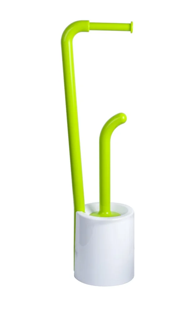 Напольная стойка для унитаза с держателем туалетной бумаги и ёршиком. Белый пластик с зелёными элементами.