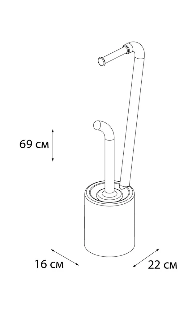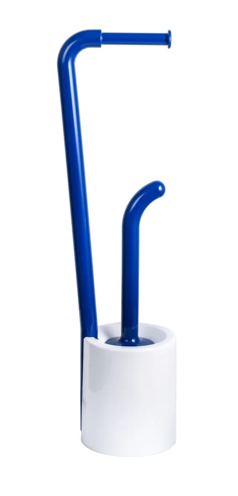 Напольная стойка для унитаза с держателем туалетной бумаги и ёршиком. Белый пластик с синими элементами.