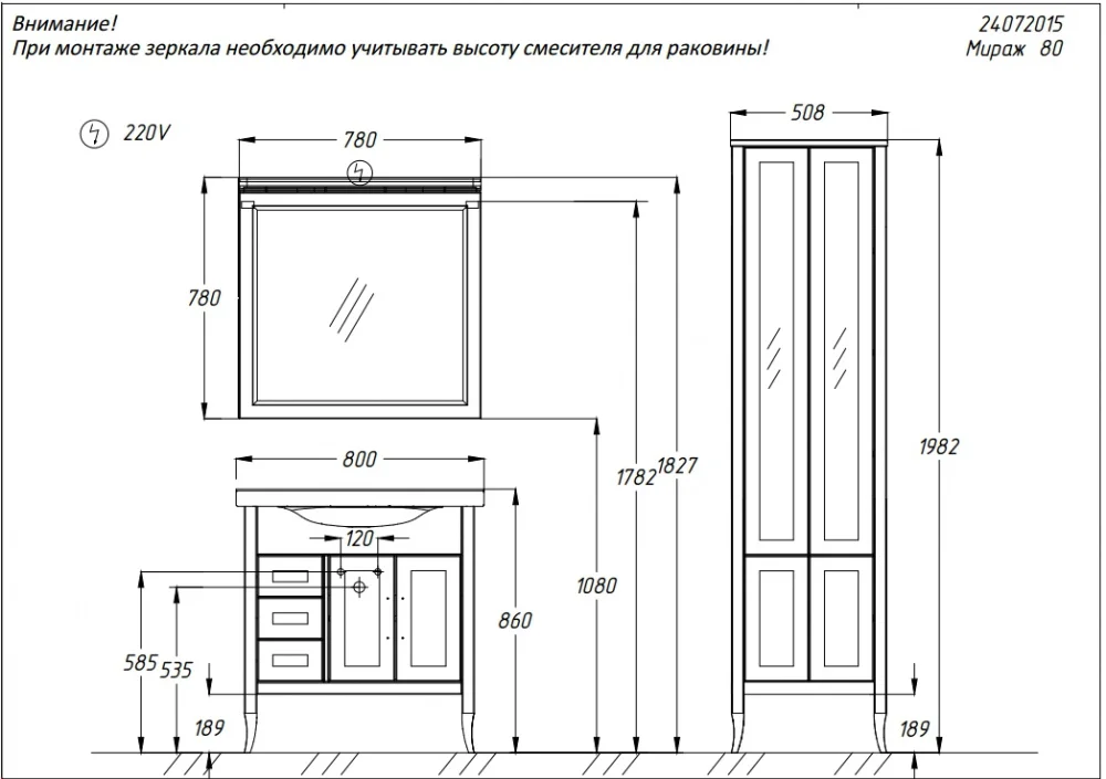 Коллекция Мираж сочетает в себе элементы неоклассического стиля и современной итальянской классики. Особую уникальность мебели из коллекции Мираж придают отделка Светлый Орех и оригинальная фурнитура ручек. Коллекция Мираж поражает своей вариативностью в решениях – большой модельный ряд 65 см, 80 см, 100 см и 120 см, а также оригинальные дополнительные решения для хранения: напольные комод и одностворчатый и двустворчатый пеналы, зеркала с дополнительными навесными шкафами.