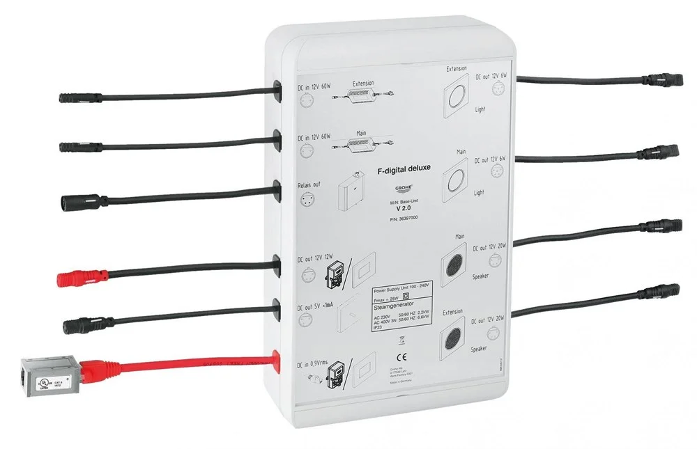 - - 2 соединения, каждый для одной пары светового модуля (36359000 (Световой модуль для систем GROHE F-digital deluxe)) или для одного потолочного душа (27865000 (Потолочный душ со встроенным источником света для систем GROHE F-digital deluxe, хром)) со встроенным источником света