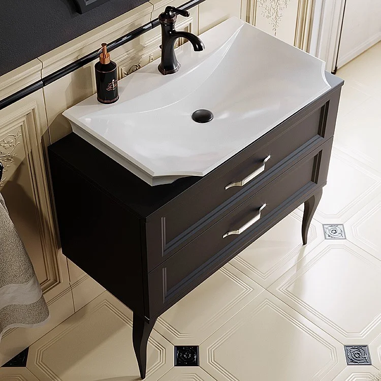 Напольная тумба с двумя ящиками в черном матовом цвете с умывальником из литьевого мрамора