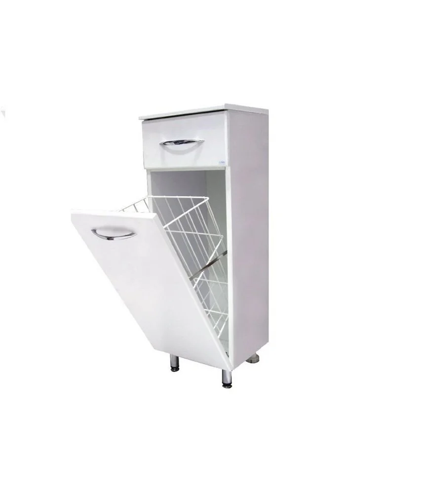Оптимальная высота Шкаф-пенала позволяет использовать его поверхность как дополнительную столешницу, небольшой удобный ящик с направляющими полного выдвижения подойдет для хранения мелких аксессуаров, а за дверцей скрывается отделение с корзиной для белья.