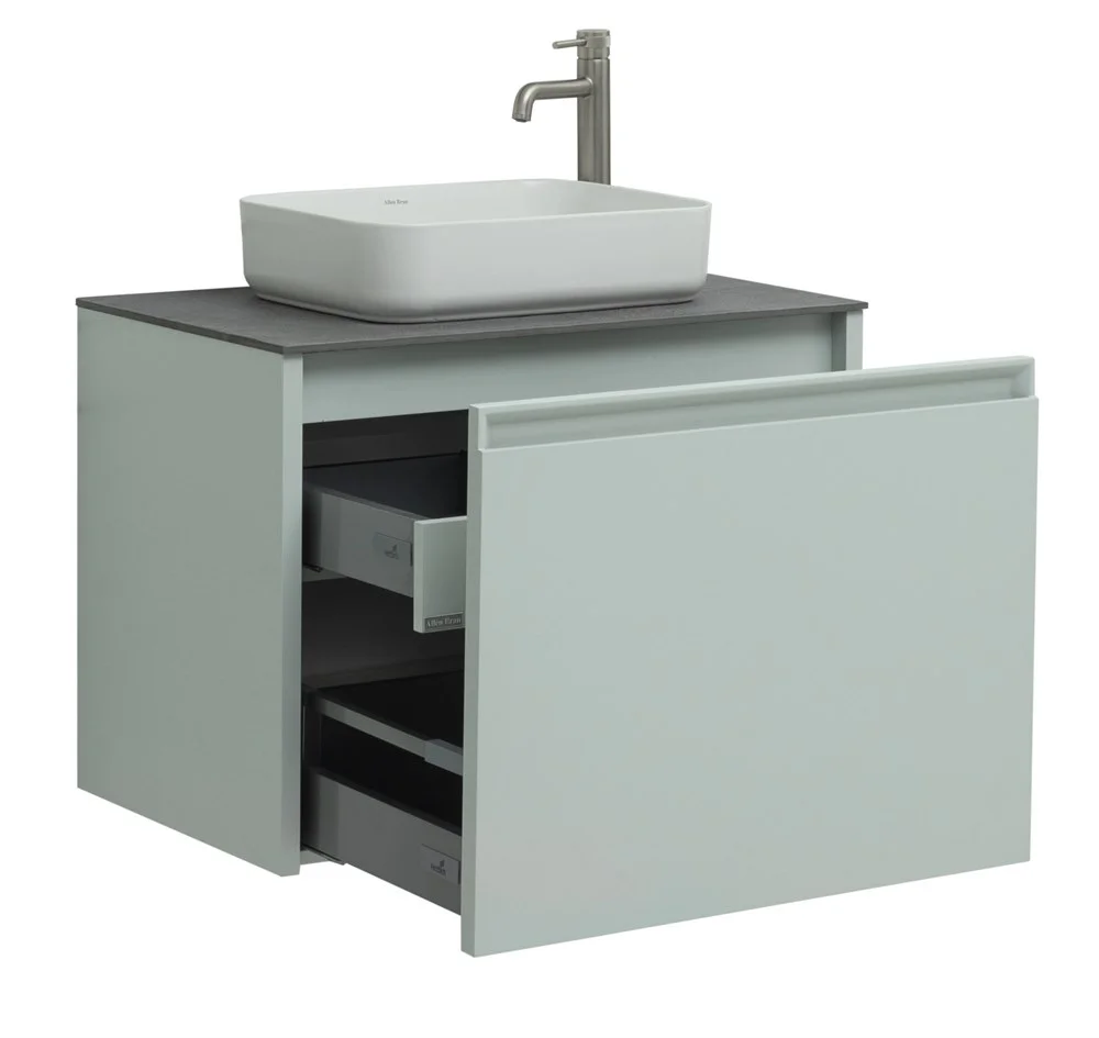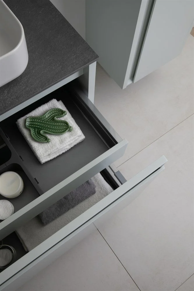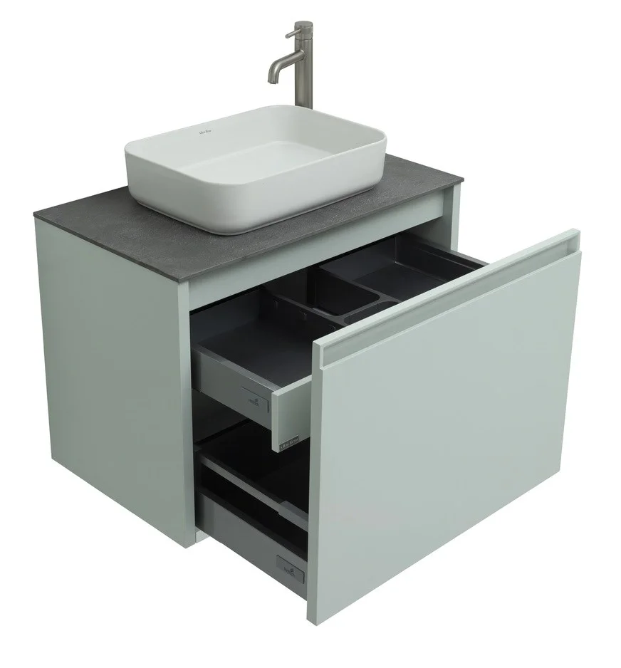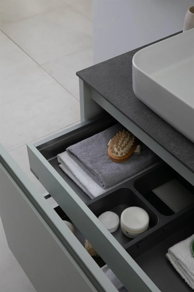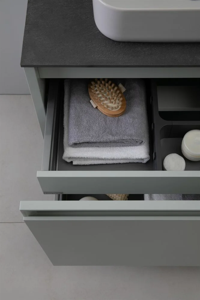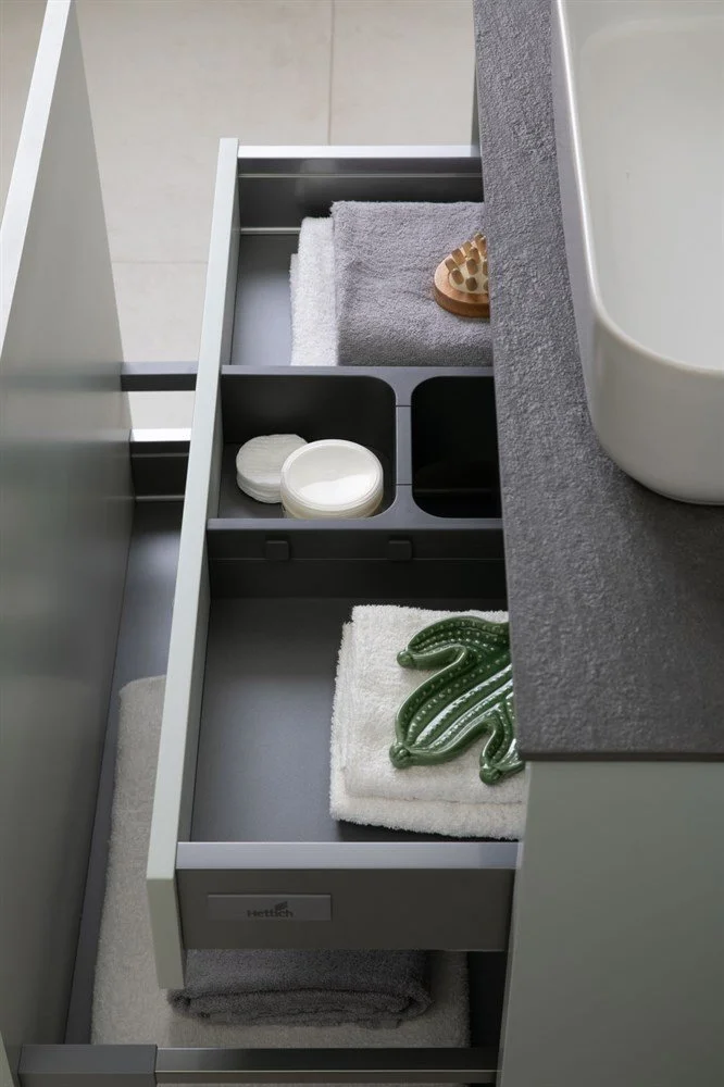 Выдвижные ящики с металлическими боковыми стенками в цвете серый металлик.