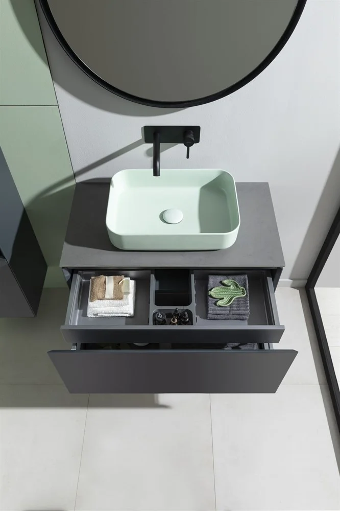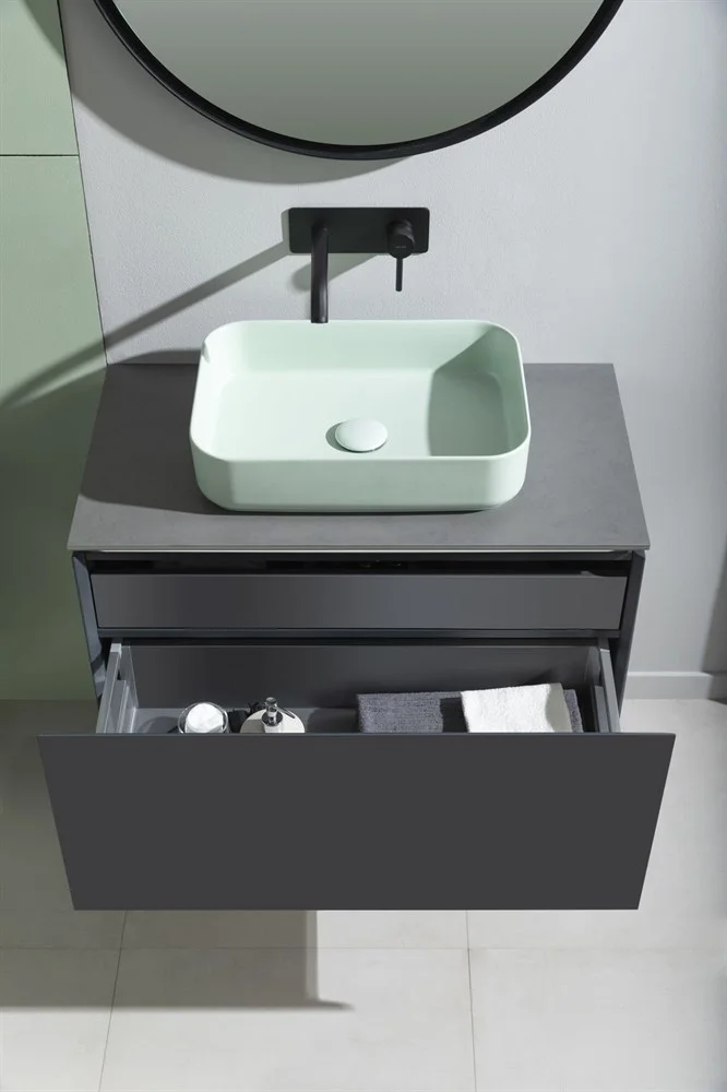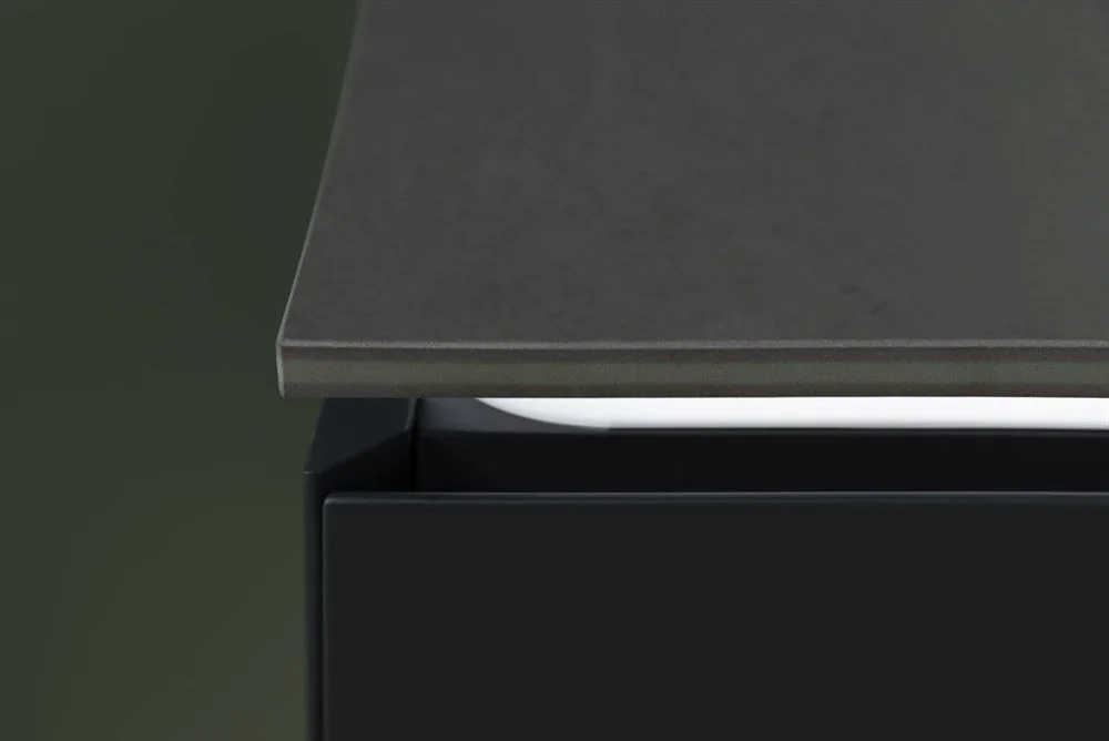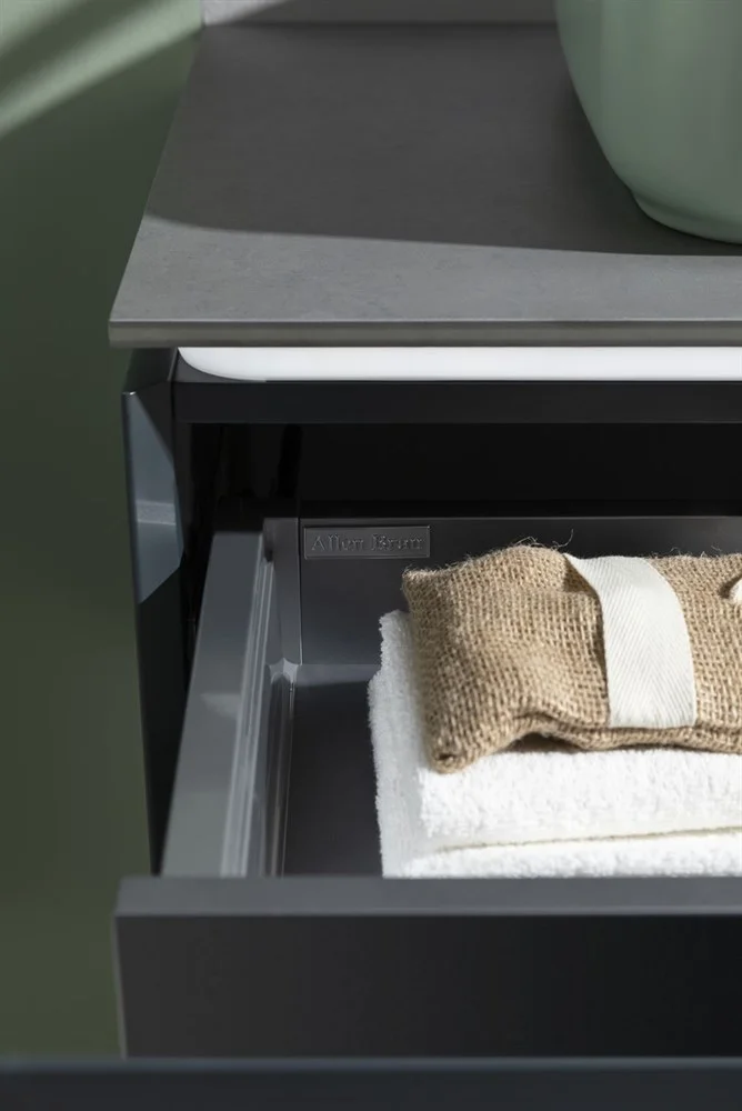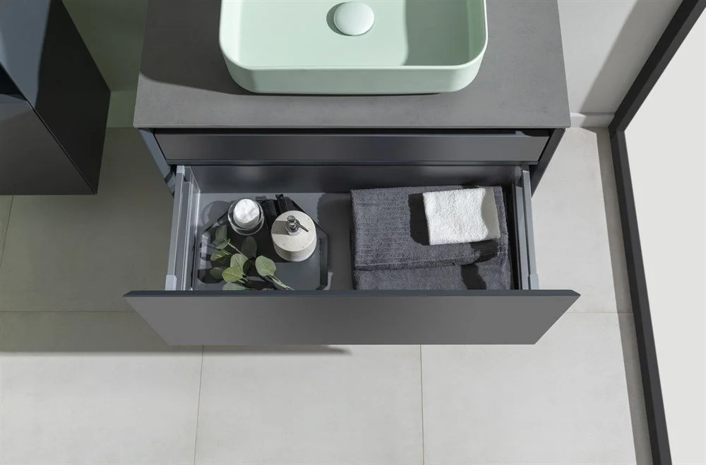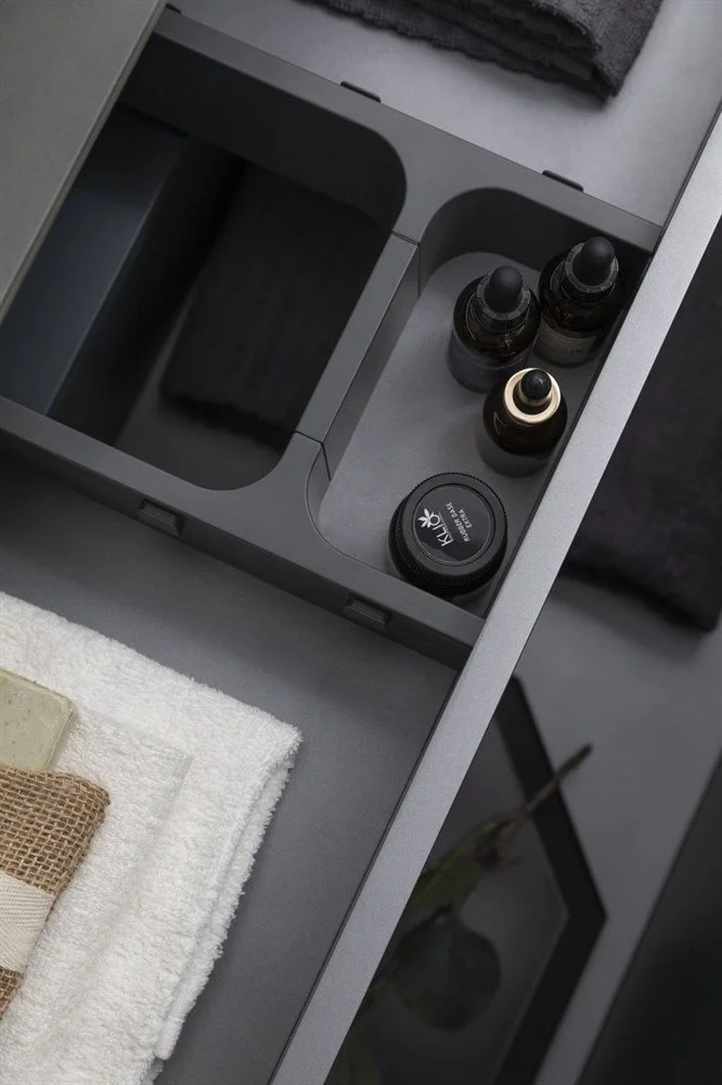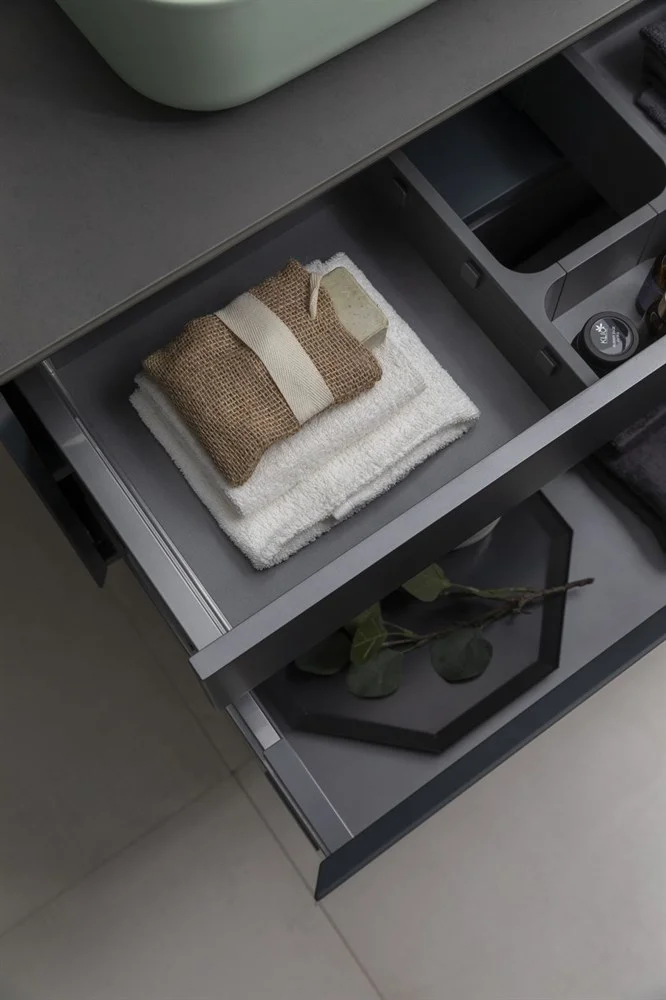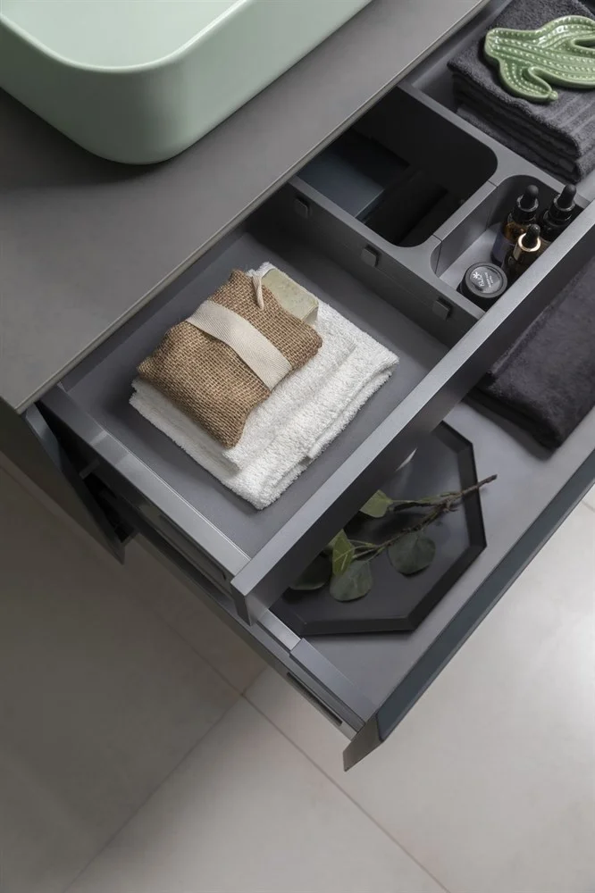 Выдвижные ящики с металлическими боковыми стенками в цвете серый металлик.
