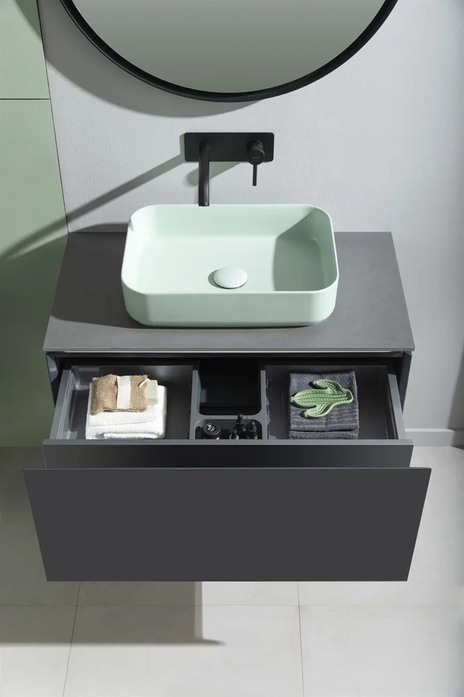 Выдвижные ящики с металлическими боковыми стенками в цвете серый металлик.