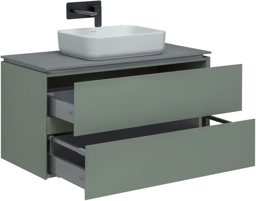 Выдвижные ящики с металлическими боковыми стенками в цвете серый металлик.