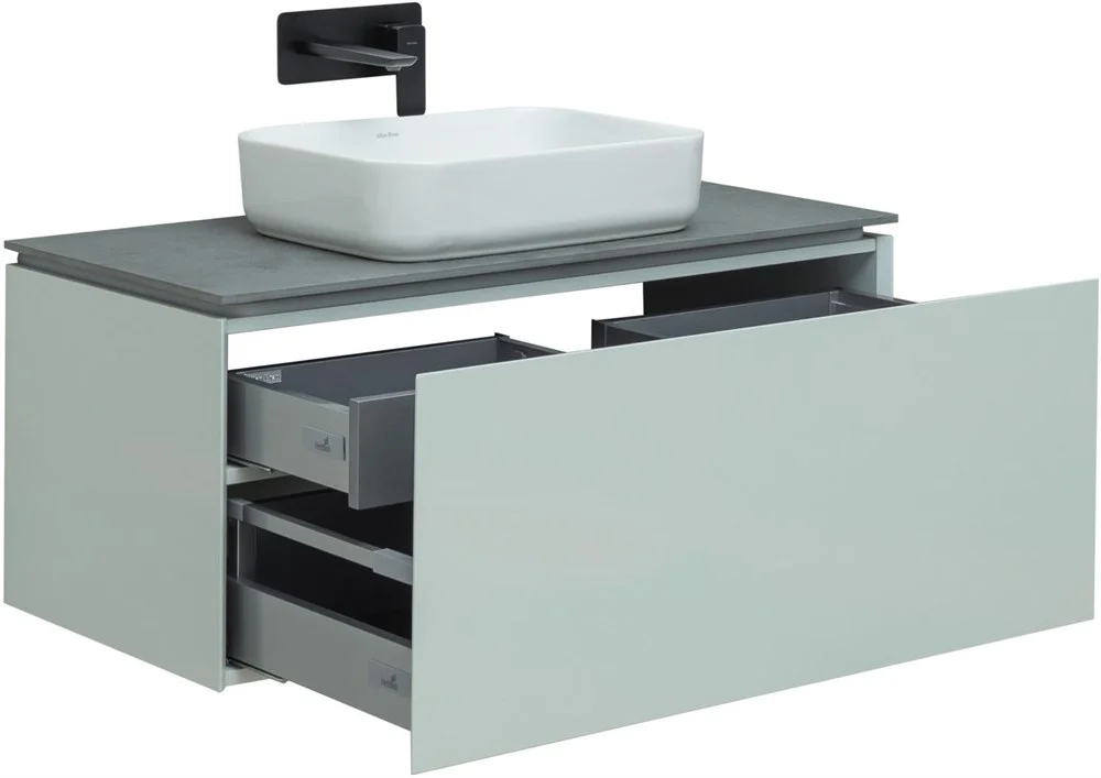 Выдвижные ящики с металлическими боковыми стенками в цвете серый металлик.