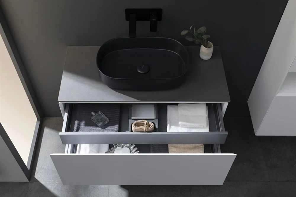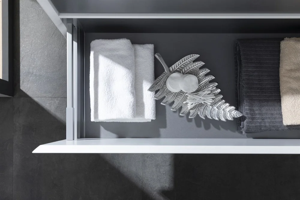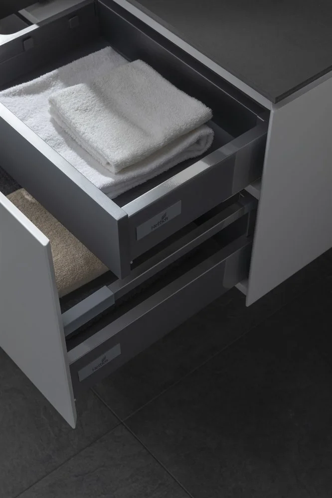 Выдвижные ящики с металлическими боковыми стенками в цвете серый металлик.