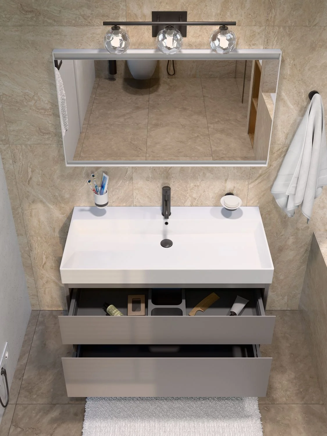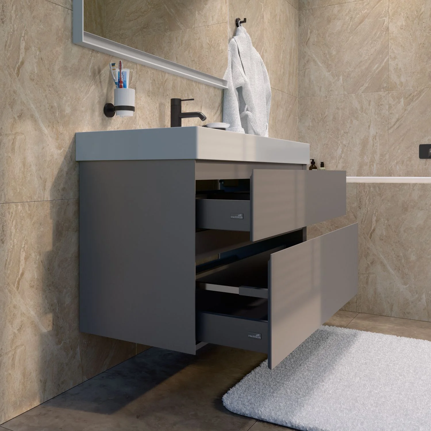 Тумба оснащена направляющими Hettich полного выдвижения. Металлические боковые стенки ящиков повышают прочность. Фасады имеют удобную ручку-фрезеровку на верхнем торце. Пластиковое ограждение сифона позволяет закрепить дополнительные контейнеры для хранения.