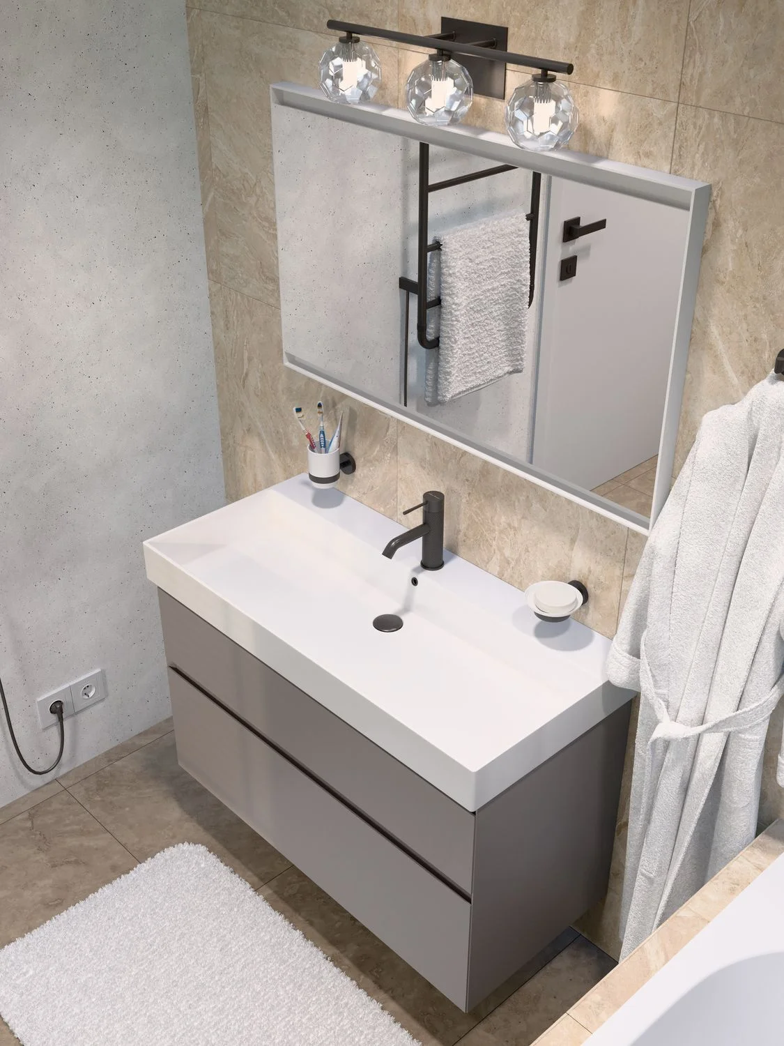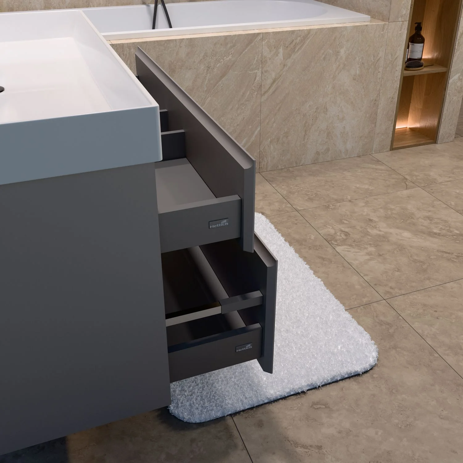 Подвесная конструкция делает пространство визуально легким и свободным. Корпус и фасады изготовлены из МДФ с матовой эмалевой отделкой. Покрытие наносится в семь слоев, включая обработку торцов, что гарантирует долговечность. Внутренние ящики сделаны из ВЛДСП цвета антрацит.